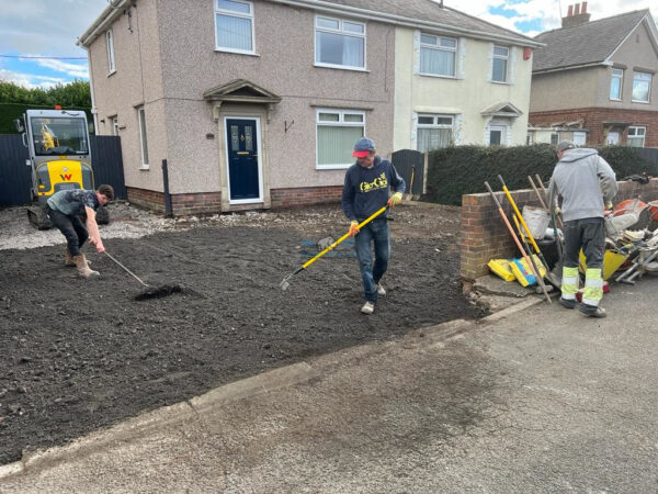 Here are some before, during and after photos of a driveway transformation completed by Rhino Pave in Mold, Flintshire. The driveway features slate grey block paving in a 45° pattern with double and single charcoal borders and a new matching doorstep.