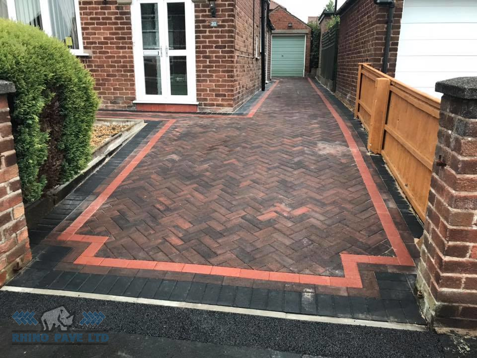 New driveway installation in Shotton, Flintshire. Replaced the old driveway area, side path and patio area. Replaced it with new block paving. The paving used was the main colour of brindle blocks from Marshalls, a charcoal border and a red paving block to make the dark stand out on the driveway. Large half patterned diamond installed on the patio area.